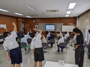 前半は、参加者全員で“みとよ元気体操”や“脳トレクイズ”に挑戦しました。また、ボランティアとして参加した本校のバレーボール部の紹介をさせていただきました。