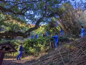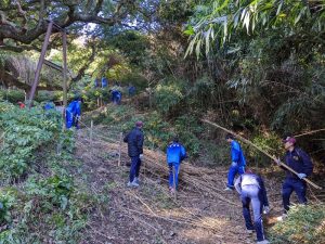 午後からは、再び山に入り、3か所(大楠・楠の倉・横尾の辻)に分かれて作業を行いました。刈り取った後の草を取り除く作業はかなりの重労働でしたが、大自然の中で地域の皆さんと一緒に楽しく作業をさせていたき、貴重な経験ができました。現場までの山道も険しく、改めて自然を守っていくことの大変さを感じることができました。