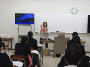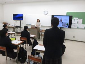 衛生看護科3年生授業風景 11月21日(金)、丸亀にある「助産院ゆるり」から鈴木先生を講師にお迎えし、衛生看護科3年生を対象に母性看護について講義をしていただきました。妊娠期から産褥期までの女性の体の変化や、心と体の関係、医療従事者としての関わり方について動画を視聴しながらわかりやすく教えていただきました。押しつけの看護ではなく、相手が何を望んでいるのかを傾聴し、そこに向けてサポートする大切さを学びました。