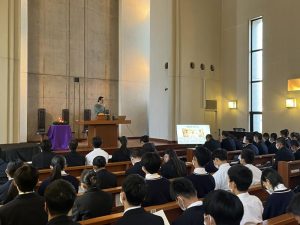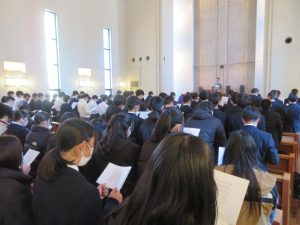 四国学院大学チャペル体験 12月16日(火)、1年生全員で四国学院大学訪問し、クリスマスチャペル体験を行いました。宗教委員長のネルソン橋本ジョシュア諒先生より、キリストの意味やクリスマスにまつわるお話をしていただきました。また、パイプオルガンの伴奏で『きよしこの夜』をみんなで歌いました。パイプオルガンの音は心臓に響くように太くて深く、とても印象に残りました。最後は各クラスで大学内を散策し、立派な図書室や寮、食堂の見学をして帰りました。