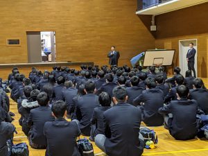 7月21日(火)、ベネッセコーポレーションの玉橋唱平先生を講師にお迎えし、3年生を対象にキャリア教育が行われました。今回は、新型コロナウイルス感染症対策として、十分な距離をとり、3密を避けて体育館で実施しました。