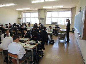 まず初めに四国学院大学の 山口孔丹子先生によるクリスマスリースを作成する意味についての講義がありました。初めてクリスマスリースの意味を 知る生徒が多く、驚いている様子でした。