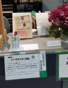本校で取り組んでいるシトラスリボン運動の一貫として、作成した「しおり」を豊中町立図書館とみとよ子ども図書館に置いていただきました。