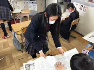 また、SDGsの取り組みの1つとして「新聞紙エコバッグ」を一緒に作りました。途惑いながらも工夫しながら、楽しく作り進め、分からない所は本校の生徒に質問していました。高校生は小学生に分かるように説明するのに悪戦苦闘していましたが、全員見事な新聞紙エコバッグを作ることができました。完成したときの子どもたちの笑顔がとても印象的でした。