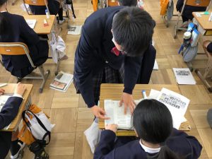 そこで、2月25日(木)、2年1組の3人(森本さん・前野さん・塩田さん) がSDGsの説明に勝間小学校を訪れました。児童の皆さんは、本校の生徒の説明を真剣に聞き、大事なところはメモを取っていました。