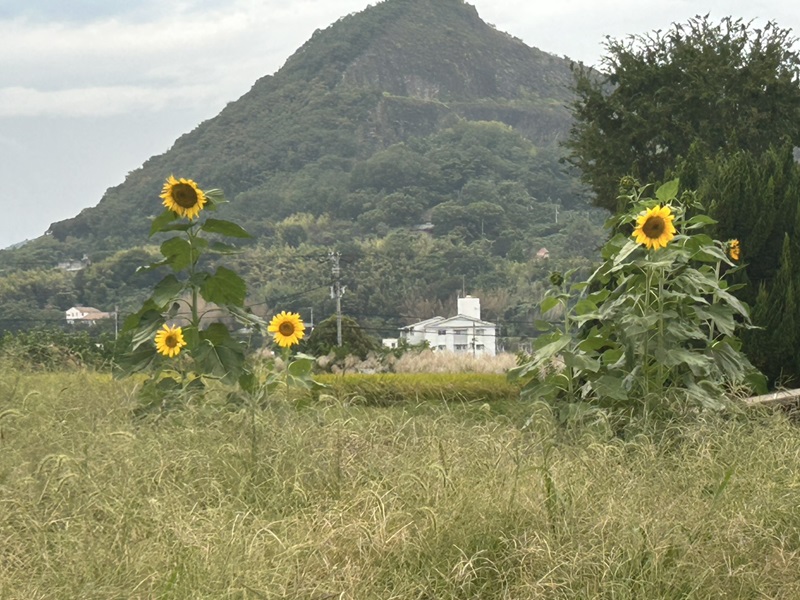 畑近くを歩いていると・・・なんとひまわりが堂々と咲いていました!恐らく、役割を終えたひまわりが種をこぼし、その種が雑草に負けずにすくすく成長したものと思われます。真夏に咲くひまわりよりも、秋に咲くひまわりのほうが花や葉の痛みが少なく、より美しい姿を楽しめるそうです。