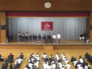 11月5日(水)、賞状伝達式が行われ、各競技大会において優秀な成績を残した陸上部、駅伝競技部、女子サッカー部、女子バレー部に教頭先生から賞状やトロフィーが送られました。
