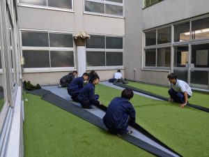 いよいよ中庭の人工芝を敷く作業に取りかかりました。壁側からしわを伸ばし、重ねながら1枚1枚丁寧に敷いていきました。1学期からウッドデッキの撤去作業から始まり、みんなで協力しながら進めてきたことが形として目に見えるようになり、とても嬉しいです!