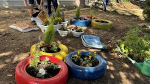 未来行動学Ⅰは、いよいよ中庭の人工芝の仕上げに取り掛かりました。芝の裏面に両面テープを貼るグループと、手作りのタイヤプランターに観賞用の花を植えるグループの2つに分かれて活動しました。