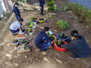 中庭の清掃活動とペンキを塗ったテーブルと椅子を校内へ運びました。徐々に自分たちが作ってきたものが形になりつつあり、生徒たちもみんなで協力し、手分けしながら頑張る姿が多くなってきました。