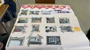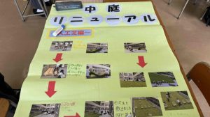これまでの活動や学びを振り返りながら、文化祭での展示に向けて模造紙を使ったまとめ作業を行いました。生徒たちは3グループに分かれ、中庭のリニューアルをメインテーマに、「人工芝編」「ペンキ塗り編」「お掃除&片付け編」と、グループの個性を出し、これまでの作業の流れをまとめていきました。文化祭当日は、実際にリニューアルされた中庭のお披露目と生徒たちの言葉や想いが詰まった展示をぜひご覧ください。