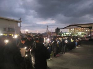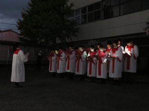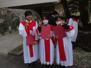 校長先生あいさつの後、朝位牧師による聖書朗読・お祈りが行われ、参加者全員で讃美歌を合唱しました。
