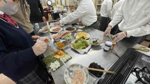 今日は2学期最初の未来行動学Ⅰの授業でした。9月1日が「防災の日」だったこともあり、クラスで防災について勉強をしました。もし、災害が起こった時、自分が持ちだす大事なものは何か?非常食にはどんなものがあるかを考え、実際に学校に準備している「非常用持ち出し品」を見せてもらいました。授業の最後には、水やお湯で作った炊き込みご飯ときな粉餅、パン、ようかんを試食しました。お家の人とも、防災についての話をするきっかけになればいいなと思います。