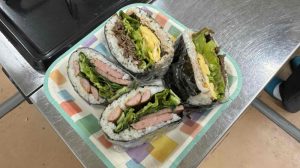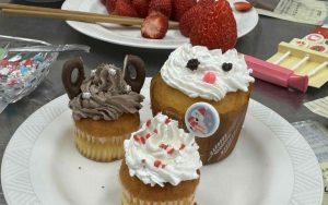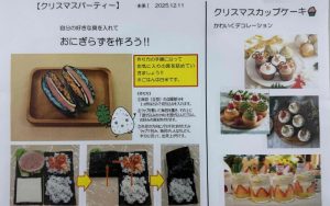 クリスマスソングを流し、キャラクターグッズで身をまとったりして、ちょっと早いクリスマス気分を味わいながら、自分の好きな具材を選んで“おにぎらず”作りに挑戦し、その後はクリスマスカップケーキのデコレーションにも取り組みました。