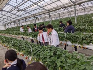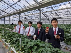 授業時間帯を利用して、「がっこうのいちご園 財田上」へ苺狩りに行ってきました。はじめに、苺の育て方や特徴について説明を聞き、その後、実際にいちご狩りを体験しました。今が一番旬ということもあり、粒が大きく、とても甘い苺を頬張っていました。生徒たちはついつい食べ過ぎてしまっていた様子で、お腹いっぱいになるまで楽しむことができました。また、三豊ケーブルテレビの取材もあり、生徒たちは少し緊張しながらもインタビューを受けていました。学校での取り組みをたくさんの方に知っていただける良い機会になればいいなと思います。